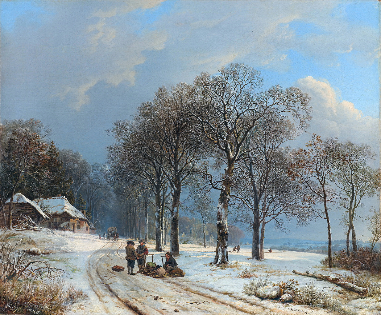 IJzig koud is het in dit winterlandschap van Barend Cornelis Koekkoek. Overal ligt sneeuw, op de daken van de huizen, op de bomen, op de takken, zelfs op de kleinste greepjes. De loodgrijze lucht voorspelt nog meer sneeuw. De winterzon werpt lange schaduwen over de witte vlakte, waar het landschap prachtig tegen afsteekt. De mensen zijn dik gekleed en hebben hout gesprokkeld voor de haard. (1838)