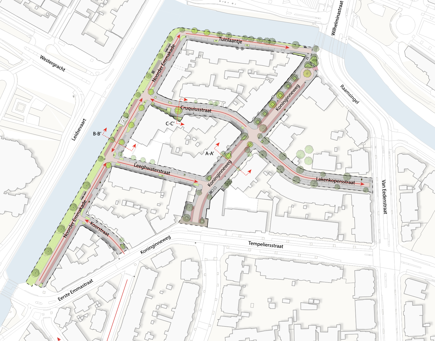 Er wordt extra groen toegevoegd door de aanleg van bomen en groenvakken, wat bijdraagt aan een aantrekkelijke en leefbare omgeving.