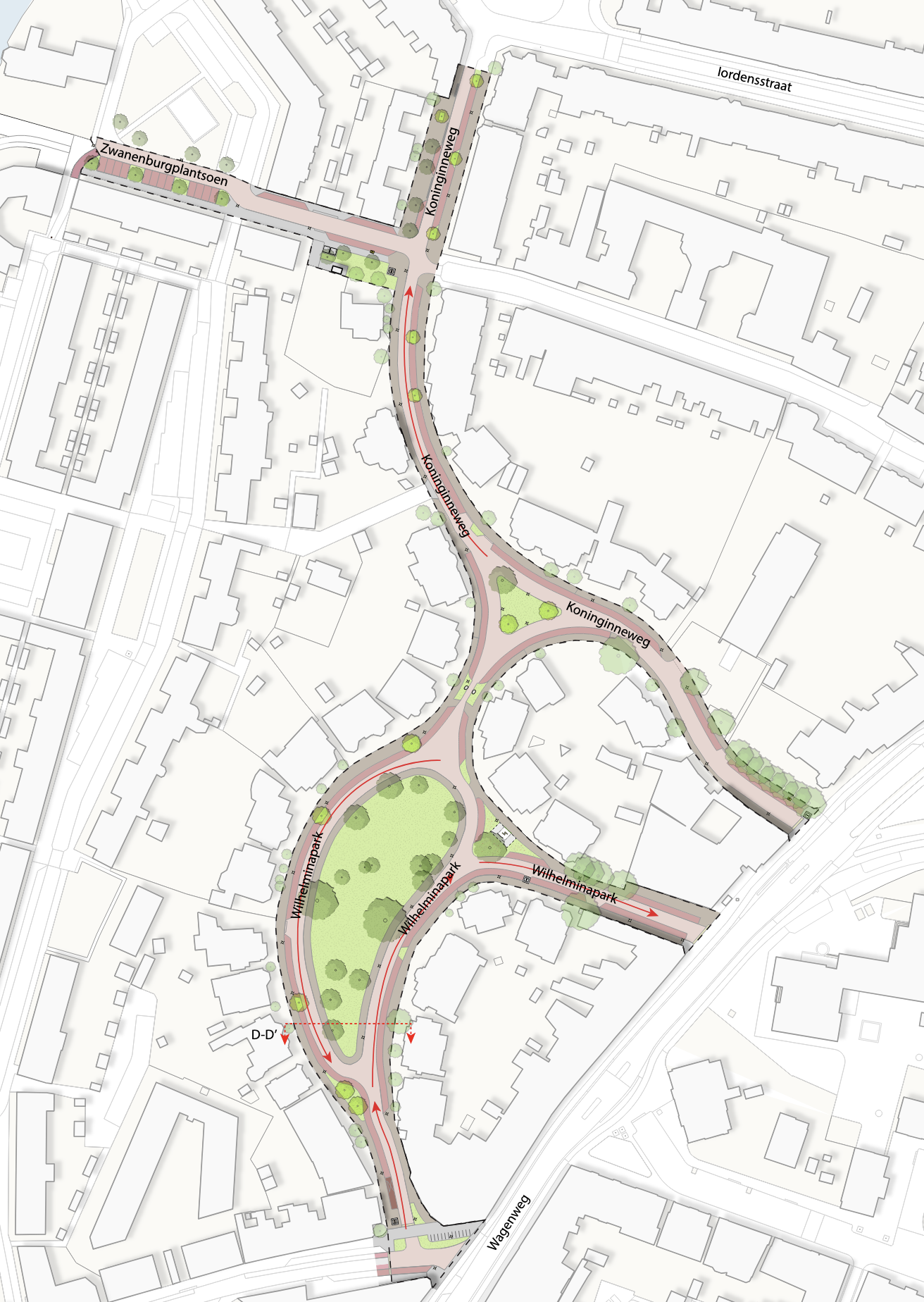 • Er komen bomen en uitstulpingen aan de randen van het park om het verkeer beter te geleiden en te voorkomen dat auto's tegen de richting in rijden.